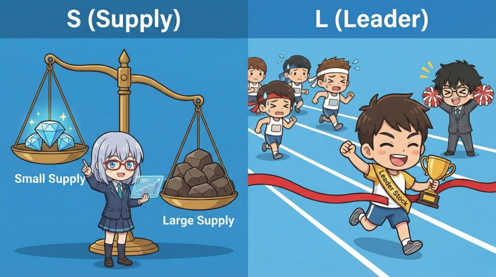 • S(需給):発行済み株式数が少ない「小型株」の方が、少しの買い注文で大きく上がります。