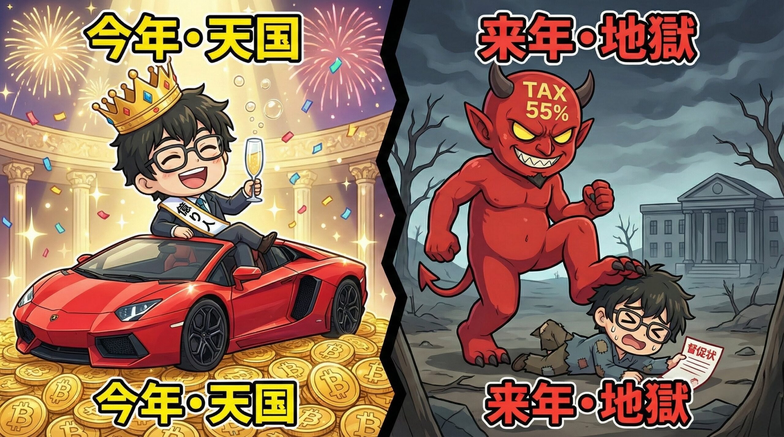 2024年:ビットコインで1億円儲けた! ヒャッハー! → 「税金分を残さず」に家や車を買って豪遊してしまう。