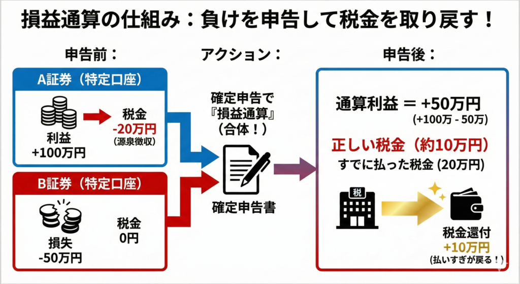 ・2026年(来年):100万円の大儲け! → 通常なら税金20万円だが、去年の損と相殺して**「利益ゼロ」扱い=税金ゼロ!**